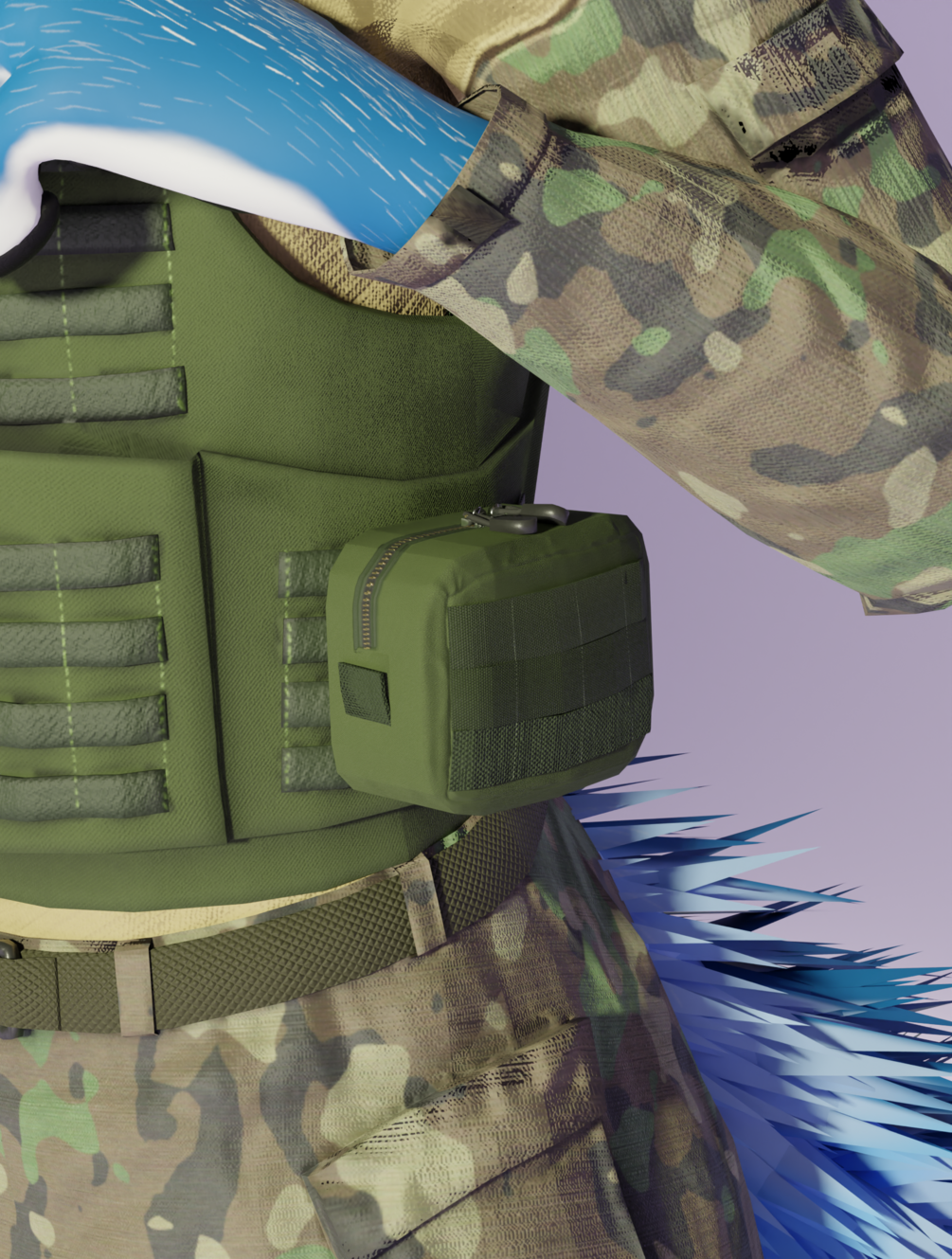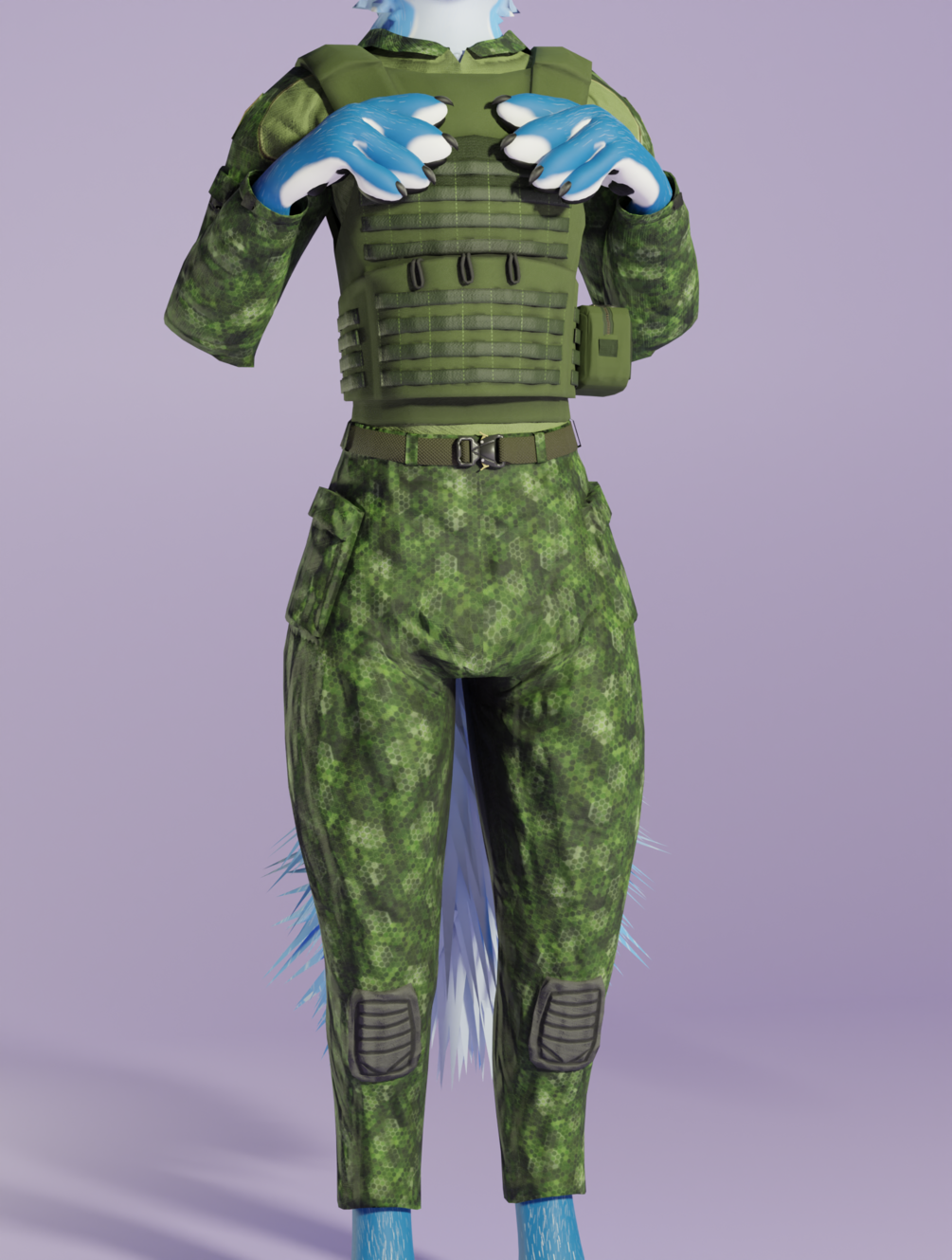 A two tone shirt, camo pants with belt and plate carrier VRChat Rexouium model.