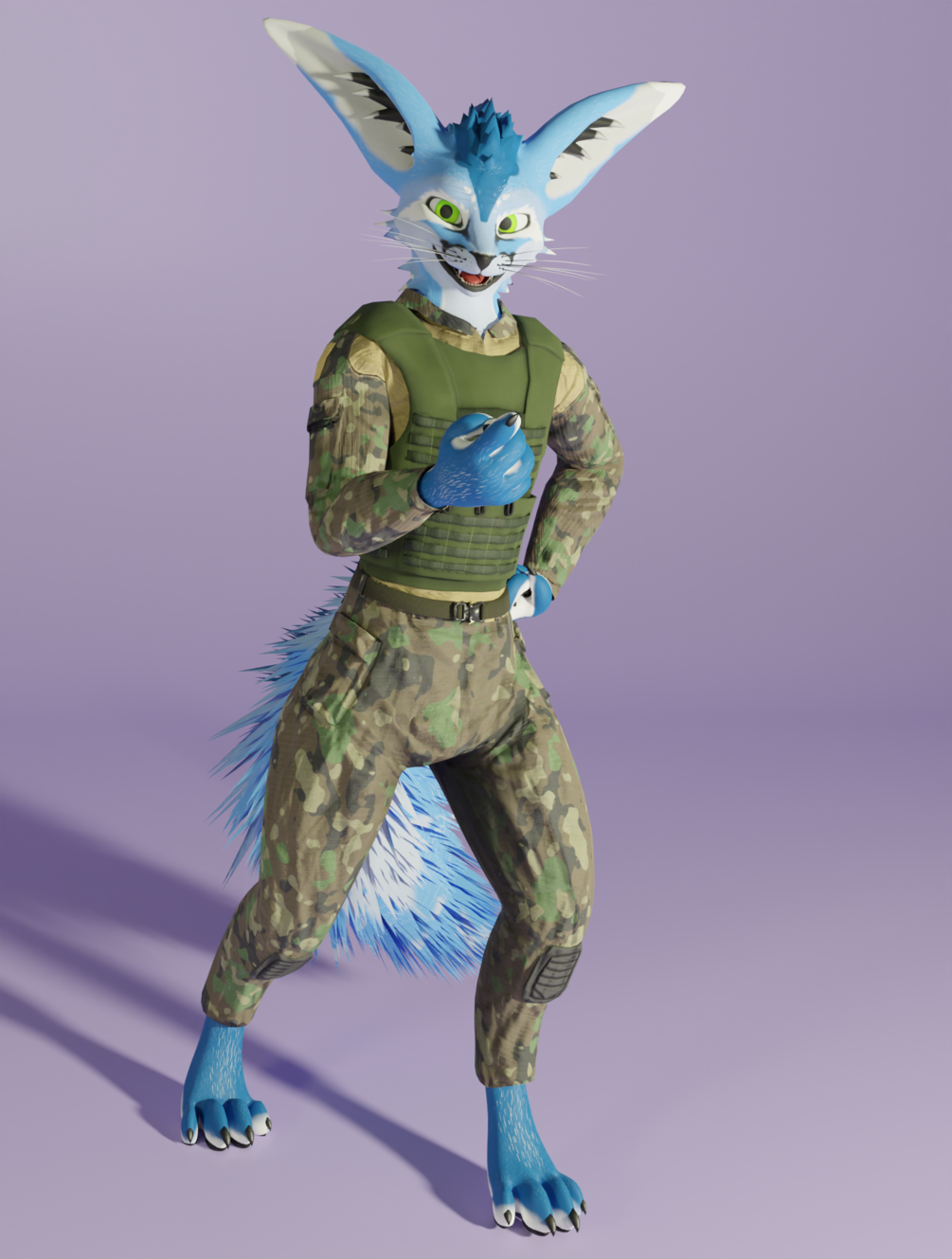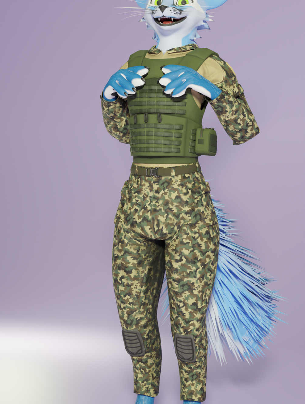 A two tone shirt, camo pants with belt and plate carrier VRChat Rexouium model.